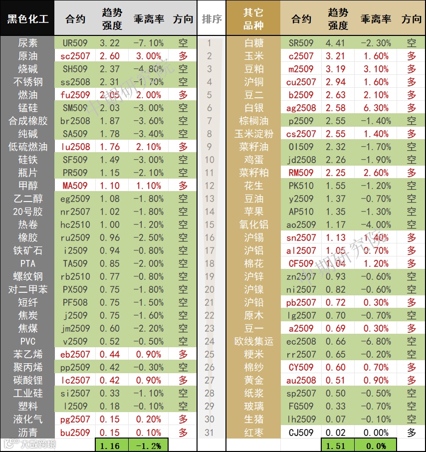 中期商品趋势榜 | 白糖、尿素空头持续 玉米、豆粕多头偏强(0611)