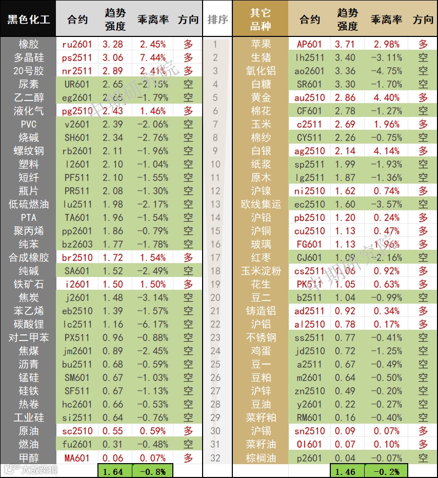 中期商品趋势榜 | 苹果、橡胶、多晶硅多头偏强 生猪、氧化铝、白糖空头强势(0908)