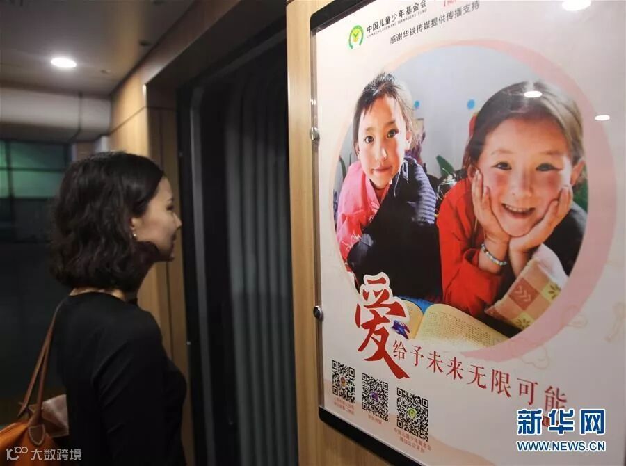 儿童公益宣传高铁列车“爱的专列”在上海虹桥火车站首发。乘客扫描二维码可以获取最新公益项目信息。新华社发