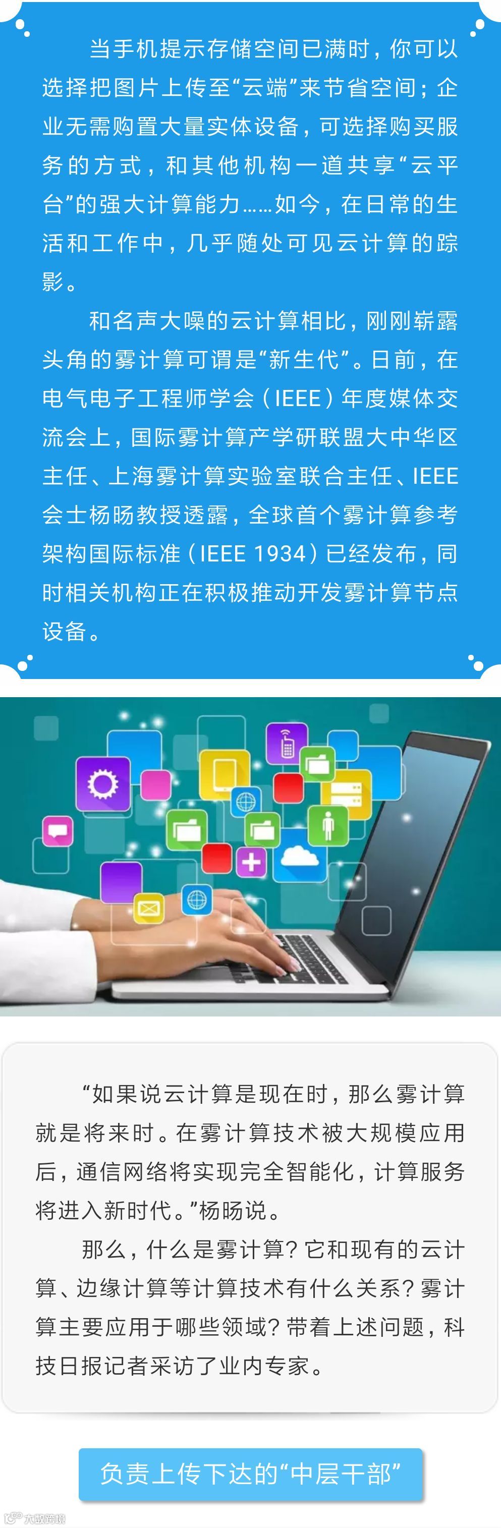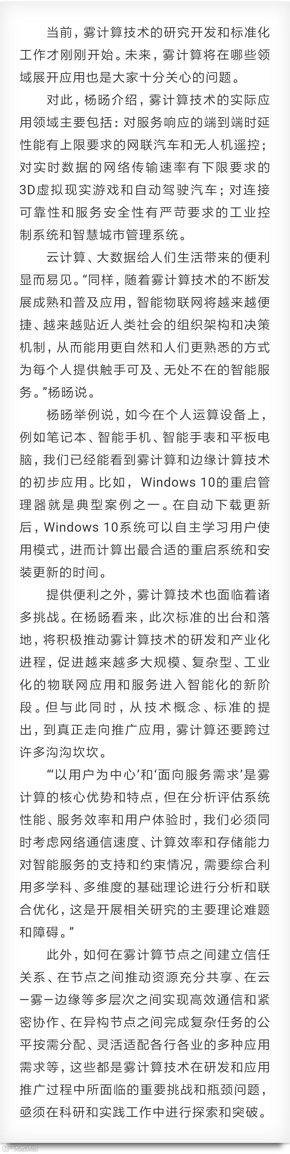 导读:在电气电子工程师学会年度媒体交流会上,国际雾计算产学研联盟大中华区主任杨旸教授透露,全球首个雾计算参考架构国际标准(IEEE 1934)已经发布,同时相关机构正在积极推动开发雾计算节点设备。