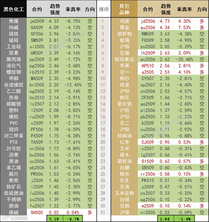 中期商品趋势榜 | 焦煤、纯碱、硅铁、工业硅空头强势 鸡蛋、黄金多头强势(0417)