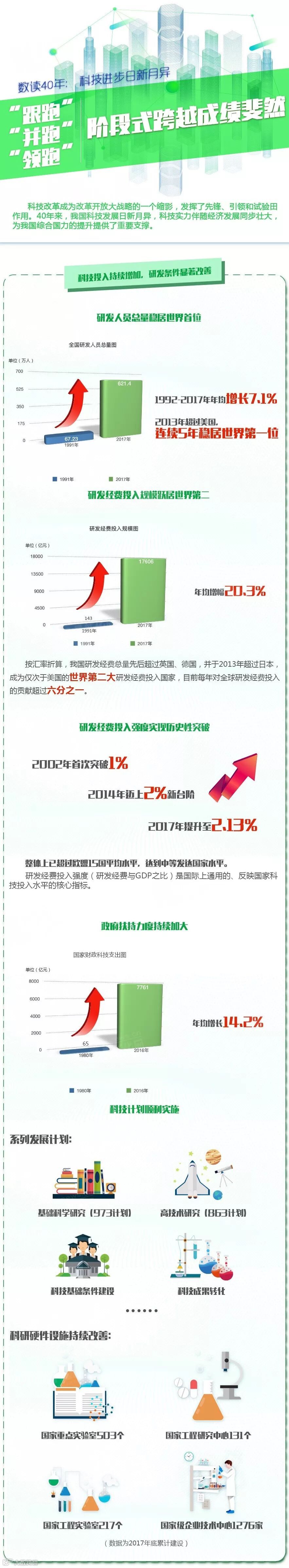 导读:科技改革成为改革开放大战略的一个缩影,发挥了先锋、引领和试验田作用。40年来,我国科技发展日新月异,科技实力伴随经济发展同步壮大,为我国综合国力的提升提供了重要支撑。