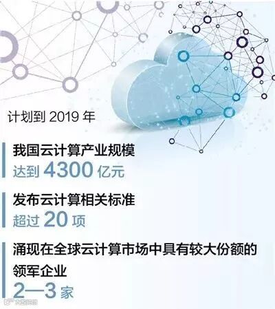 2017年3月,工业和信息化部出台的《云计算发展三年行动计划(2017—2019年)》提出,到2019年,我国云计算产业规模达到4300亿元,突破一批核心关键技术,云计算服务能力达到国际先进水平,涌现2—3家在全球云计算市场中具有较大份额的领军企业。云计算成为信息化建设主要形态和建设网络强国、制造强国的重要支撑,推动经济社会各领域信息化水平大幅提高。