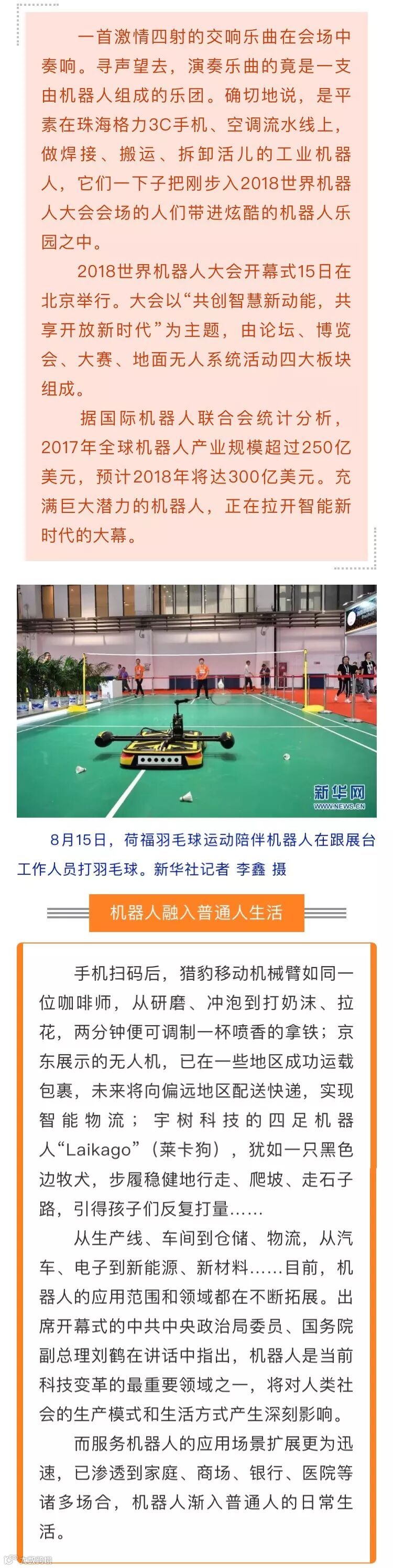 导读:2018世界机器人大会开幕式15日在北京举行。大会以“共创智慧新动能,共享开放新时代”为主题,由论坛、博览会、大赛、地面无人系统活动四大板块组成。