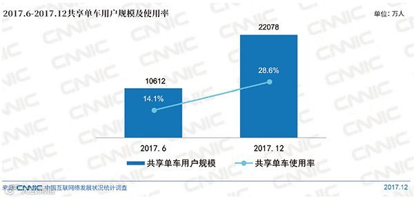 共享单车成为2017年下半年用户规模增长最为显著的互联网应用类型。截至2017年12月,共享单车国内用户规模已达2.21亿,占网民总体的28.6%,用户规模半年增加1.15亿,增长率达到108.1%。