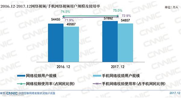 截至2017年12月,网络视频用户规模达5.79亿,较去年底增加3437万,增长率为6.3%,在网民中的使用率为75.0%。手机网络视频用户规模达到5.49亿,较去年底增加4870万,增长率为9.7%,占手机网民的72.9%。