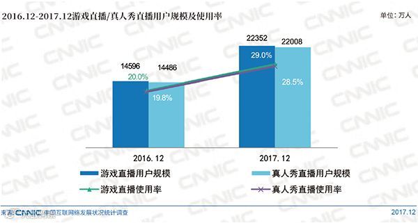 截至2017年12月,网络直播用户规模达到4.22亿。其中,游戏直播用户规模达到2.24亿,较去年底增加7756万,占网民总体的29%;真人秀直播用户规模达到2.2亿,较去年底增加7522万,占网民总体的28.5%。