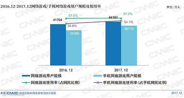 截至2017年12月,我国网络游戏用户规模达到4.42亿,较去年增长2457万人,增长率为5.9%,在网民中的使用率为57.2%。手机网络游戏用户规模较去年底明显提升,达到4.07亿,较去年底增长5543万人,增长率为15.8%,在手机网民中的使用率为54.1%。