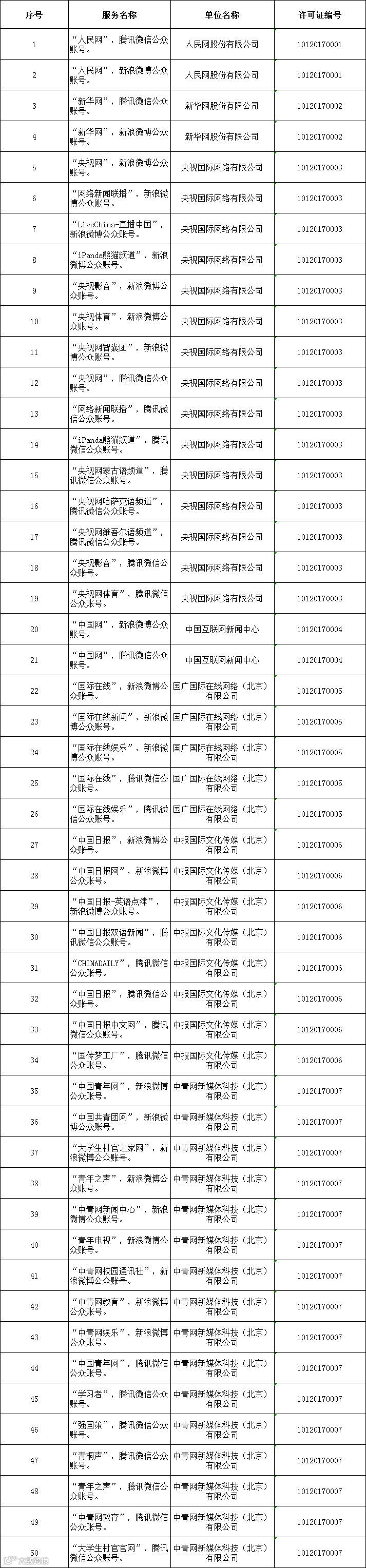 《规定》实施以来,国家互联网信息办公室组织开展互联网新闻信息服务许可证换发工作。现将中央互联网新闻信息服务单位相关许可信息予以公开,包括:互联网站94个,应用程序50个,论坛14个,博客6个,微博客2个,公众账号292个,即时通信工具1个,网络直播3个,共计462个服务项。