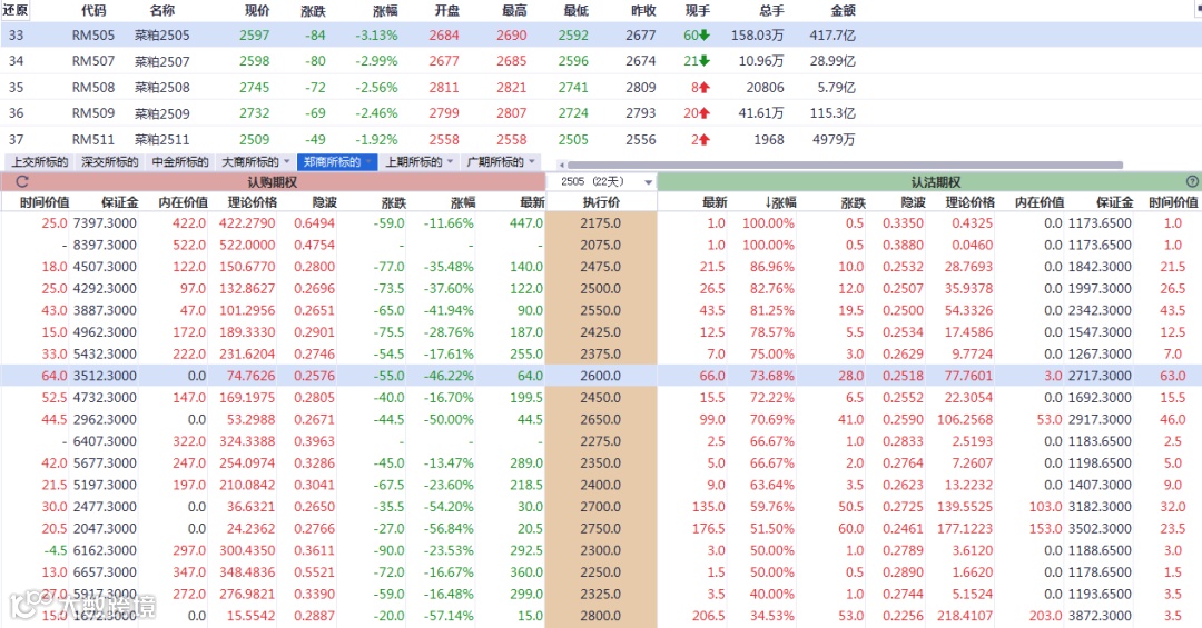 受关税政策影响,3月10日菜粕05合约期货开盘就达到涨停板,期权隐含波动率飙升,而3月11日菜粕期货虽延续涨势,但期权价格和期权波动率却开始断崖式回落。随着市场对菜粕期货“连续涨停”预期的降温,虚值期权在此次期权波动率回撤中价格坍缩更为明显,在期权交易中,遇到事件驱动后的标的期货涨停情况,采用做空波动率策略是盈亏比较好的选择,可以使用做空波动率策略获取期权波动率回归的收益,下面我们来了解一下卖出宽跨式策略。