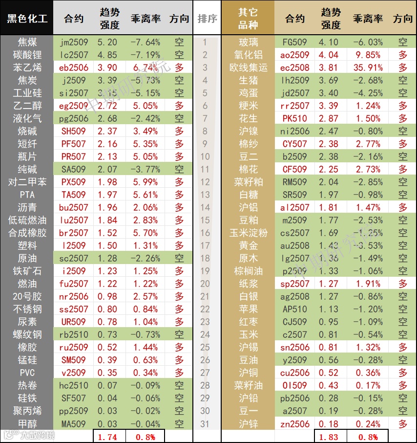 中期商品趋势榜 | 焦煤、碳酸锂、玻璃、生猪空头强势 氧化铝、苯乙烯、欧线集运多头偏强(0519)