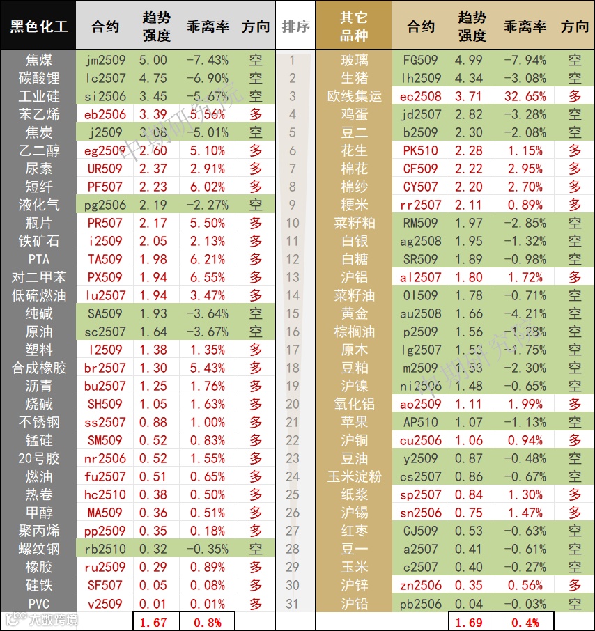 中期商品趋势榜 | 焦煤、玻璃、碳酸锂、生猪、工业硅空头强势 欧线集运、苯乙烯多头偏强(0516)