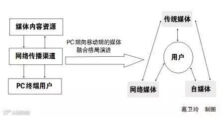 参照PC端向移动端的转化过程,我国媒体融合的格局演变可以总结为由“渠道”向“用户”的演变。在传统PC互联网媒体时代,媒体融合主要由媒介融合及涉及产业元素构成,整体上包括内容、渠道、受众三个部分,这其中渠道无疑是媒体融合的核心,即“以渠道为中心”,而移动互联网时代的媒体融合是“以用户为中心”,而这源于移动互联网技术提供的实时连接、更新功能,在突破物理空间限制之后,包括传统媒体、新兴媒体在内的组织、个体,必须产生更大的用户黏性才能保证引入端口价值。