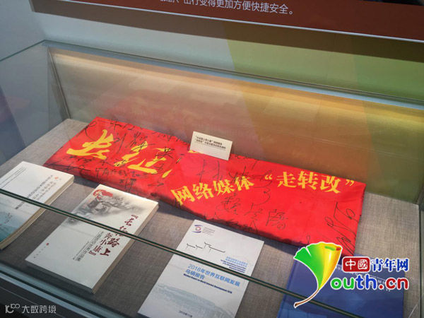 展览上展示的2016年“长征路上奔小康”网络媒体“走转改”大型主题采访活动的旗帜。中国青年网记者陈琛 摄