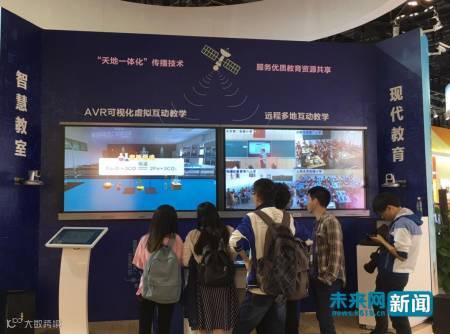 在“以人民为中心,增进群众获得感”展区,许多结伴前来观展的大学生们被互动展示区的“智慧教室”所吸引,通过一个远程多地互动教学系统,可以打通北京和新疆、云南等地的小学课堂,让身处偏远地区的孩子也能享受和北京的孩子们一样的优质教育资源。一位学生说,“我就是在北京郊区的学校上学,以前我们这边教学条件还是比较简陋的,没有比较好的老师,但是互联网的迅速发展也带动了在线教育,我们通过网络就可以轻松地看到很多优质课程。”