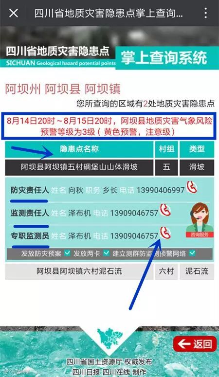 打开、选择、查询,只需几秒钟,你就能在掌上看到你所查询区域最新的地质灾害气象风险预警、地质灾害隐患点及监测责任人有关信息,姓名、职务、电话,分分钟就能get到!