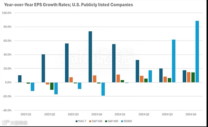 美企第三及第四季度增长预期,上图显示罗素2000成份股的增长跑赢标指及七大科技股,而当前罗素2000预期市盈率为15倍,远低于标指的22倍,这是支撑细价股的一大支柱。