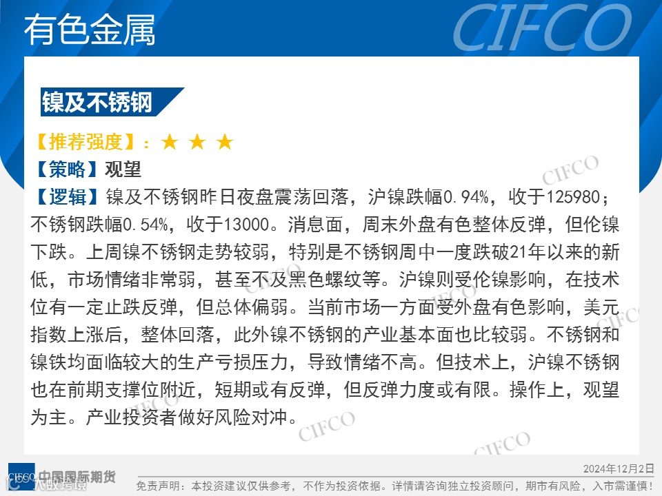 中期早知道 | 不锈钢、玉米、欧线集运弱势下跌 白糖、沥青、沪铅震荡上涨
