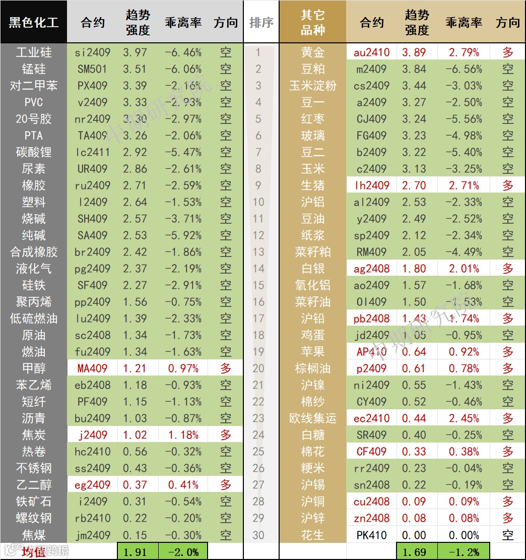 中期商品趋势榜 | 黄金多头增强 工业硅、豆粕、锰硅、玉米淀粉、PX空头强势(0716)
