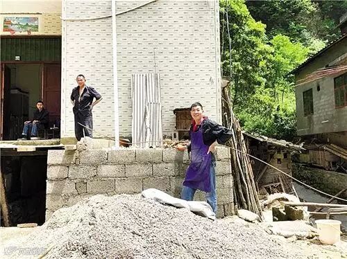 北坡村村民何天万(右一)在修建院坝