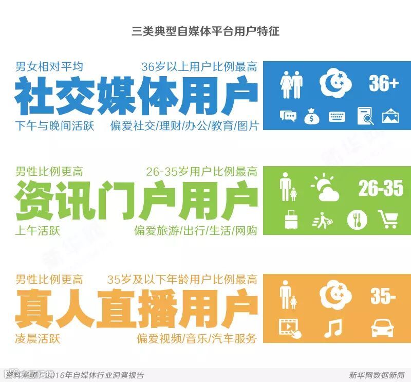不同自媒体用户的城市级别分布也存在差异,2016年,新兴的直播自媒体用户多分布在三线及以下城市,在一线城市的用户占比也在大幅提高;其他相对传统的自媒体则在二线城市有着更为明显的优势,并在向二线和三线及以下城市不断渗透。