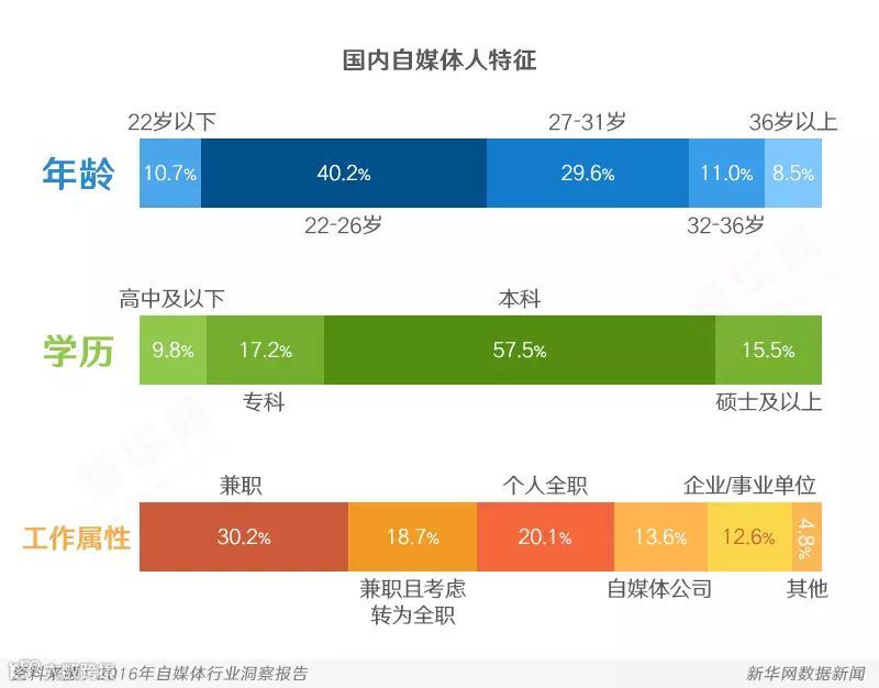 自媒体人有着相对自由的工作内容和工作时间,不论兼职或是全职都吸引着大量刚毕业的年轻人入行尝试。相关调查结果显示,大部分自媒体人在30岁以下,且接近五成的自媒体为兼职运营。