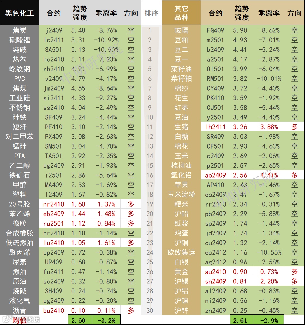 中期商品趋势榜 | 玻璃、焦炭、碳酸锂、纯碱、螺纹钢空头强势 生猪多头偏强(0814)
