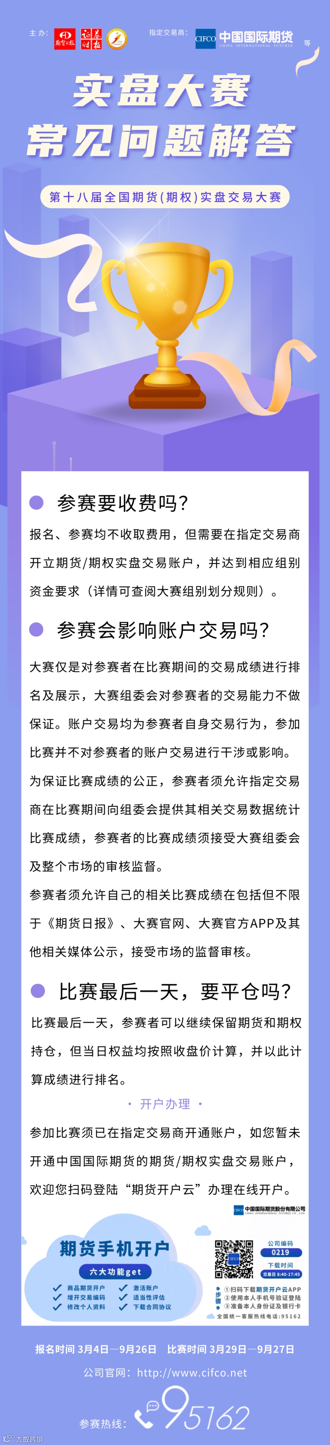 3.本届大赛由第十八届全国期货(期权)实盘交易大赛组委会负责运行,比赛规则以及其他比赛相关事项由大赛组委会负责解释。大赛组委会对比赛规则拥有最终解释权。
