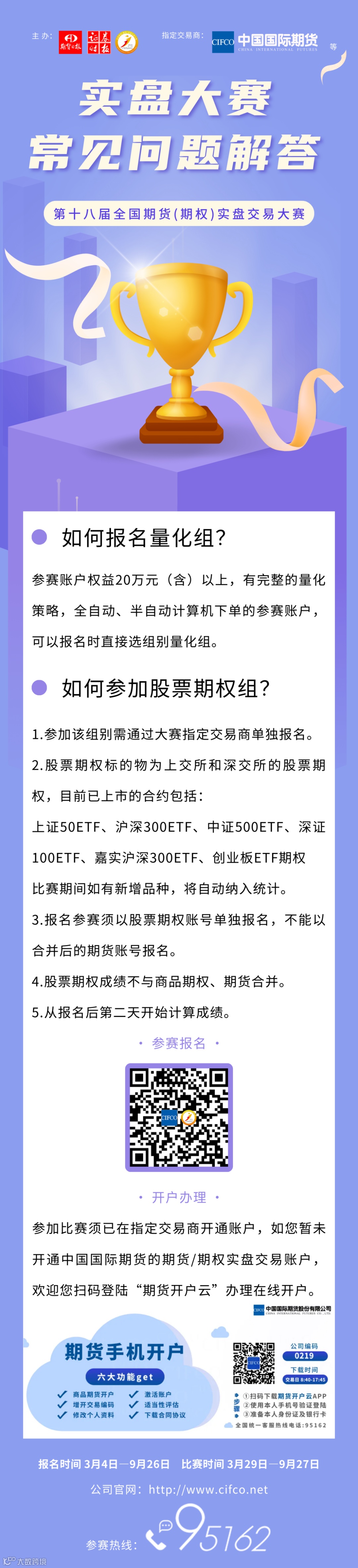 3.本届大赛由第十八届全国期货(期权)实盘交易大赛组委会负责运行,比赛规则以及其他比赛相关事项由大赛组委会负责解释。大赛组委会对比赛规则拥有最终解释权。