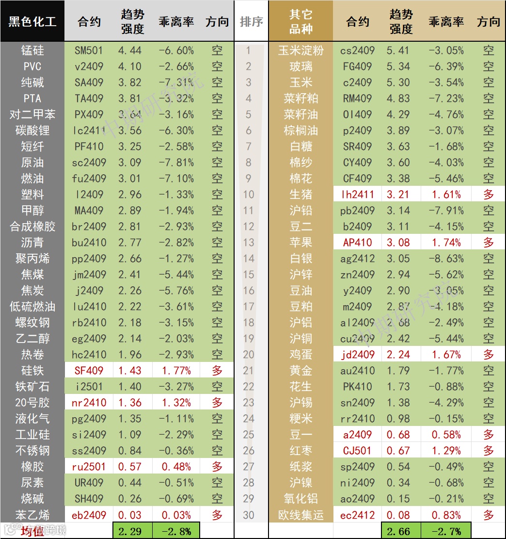 中期商品趋势榜 | 玉米淀粉、玻璃、玉米、菜粕空头强势 生猪、苹果多头偏强(0807)