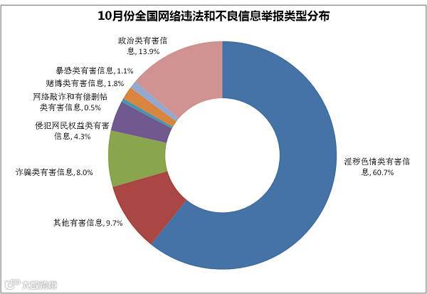 综合分析全国网络举报情况,淫秽色情类有害信息举报仍较为集中,达166.8万件,占比60.7%;政治类有害信息举报占比13.9%;诈骗类有害信息举报占比8.0%;侵犯网民权益类有害信息举报占比4.3%;赌博类有害信息举报占比1.8%;暴恐类有害信息举报占比1.1%;网络敲诈和有偿删帖类有害信息举报占比0.5%;其他有害信息举报占比9.7%。
