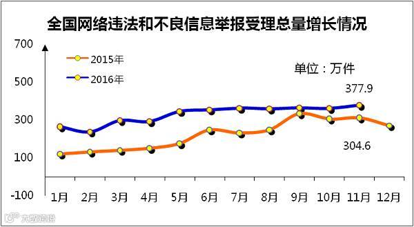2016年11月,全国各地网信办、各网站采取有力措施,积极推进网络举报工作,受理违法和不良信息举报共377.9万件,较去年同期增长24.1%。经审核,有效举报274.6万件。