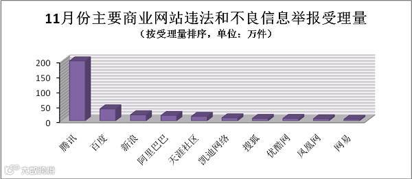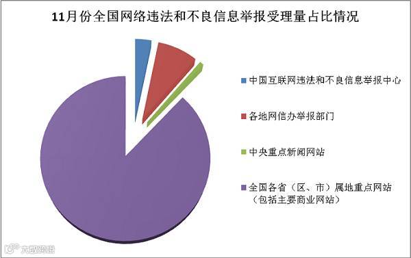 11月份,全国网络举报部门直接处置或向执法部门转交违法和不良信息有效举报258.3万件,通过各类渠道向网民反馈处置结果262.3万件。其中,中国互联网违法和不良信息举报中心直接受理有效举报31373件;各地网信办举报部门受理有效举报约24.7万件;中央新闻网站受理有效举报共438件;全国各省(区、市)属地重点网站(包括主要商业网站)受理有效举报246.8万件。