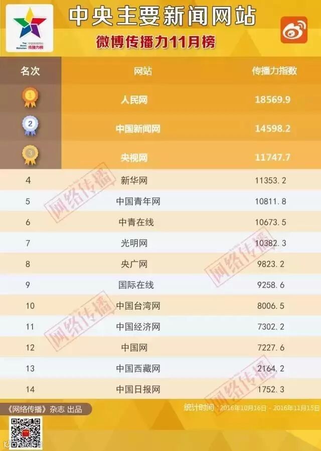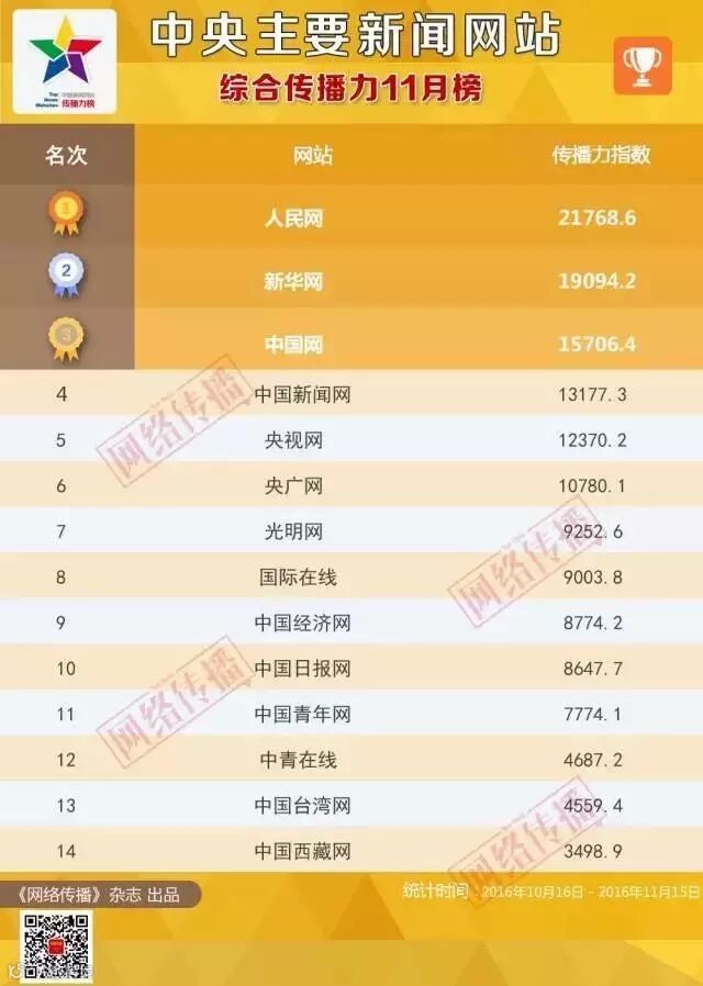 中央主要新闻网站传播力 2016年11月榜发布