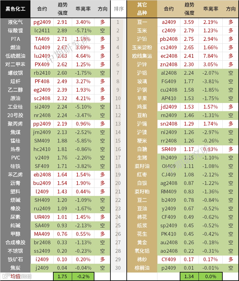 中期商品趋势榜 | 碳酸锂、螺纹钢空头持续 豆一多头增强(0628)
