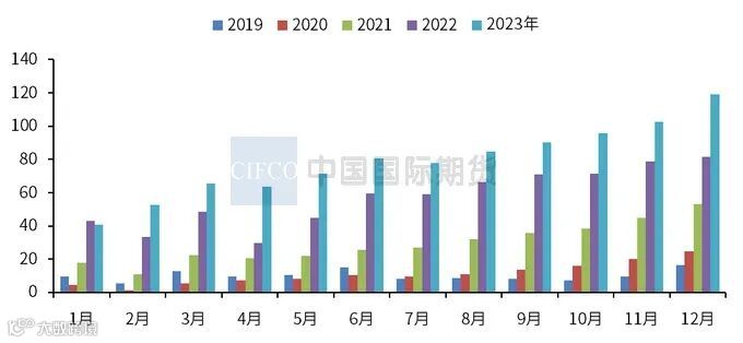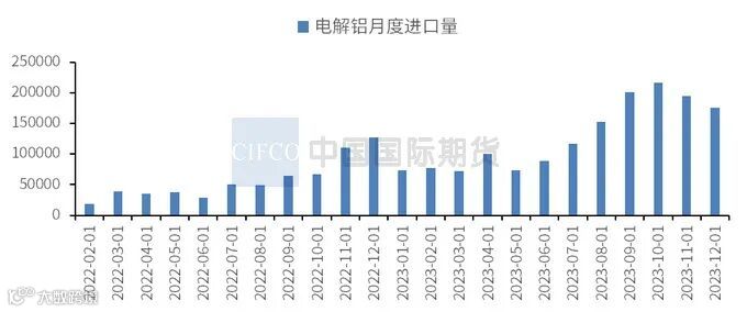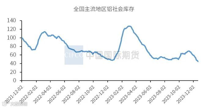 去年12月底至今年1月上旬,因进口窗口处于关闭状态,且受到云南减产对铝锭到货量的持续影响,国内电解铝社会库存经历了一波短期的累库。步入1月中旬后,电解铝社会库存迎来新一轮去库。铝价不断走低并失守19000关口,一定程度上提振了下游的补货情绪,带动主流消费地的出库表现逐步改善。铝型材行业也多适当增加企业成品库存及原料库存。截至1月22日,国内电解铝社会库存为44万吨,较上一周减少1.6万吨,较去年同期下滑30.4万吨,仍处于近七年同期低位水平。后期在下游开工率走低及铝水比例存有下调预期的影响下,1月底可能迎来季节性累库周期,届时或将累库至50-55万吨。