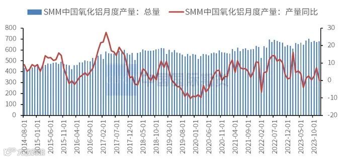 SMM数据显示,2023年12月中国冶金级氧化铝产量为679.5万吨,环比增加0.7%,同比增加5.7%。截至12月末,中国氧化铝建成产能为10000万吨,运行产能为8004万吨,全国开工率为80.0%。2023年中国氧化铝累计产量达7980.4万吨,同比增长2.7%。
