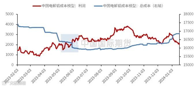 今年以来,国内电解铝总成本重心抬高,企业利润则有所下降。根据SMM 数据,截至2024年1月18日,国内电解铝总成本水平16855.78元/吨,较2023年底增加335.28元/吨,较去年同期下降868.7元/吨。从行业利润的情况来看,截至2024年1月18日,国内电解铝行业利润水平为2034.23元/吨,较2023年底减少1015.27元/吨,较去年同期增加1118.71元/吨。从短期成本变动来看,铝土矿方面,目前矿石供应紧张、能源供应问题对氧化铝企业开工构成干扰,而氧化铝需求则变动不大,预计氧化铝价格在供应偏紧的背景下震荡偏强。电力成本短期下调难度较大。原辅料市场将弱势运行,原料萤石价格僵持走低,氟化铝价格仍有下行空间。总体而言,预计电解铝成本近期将延续涨势,但上行空间有限。