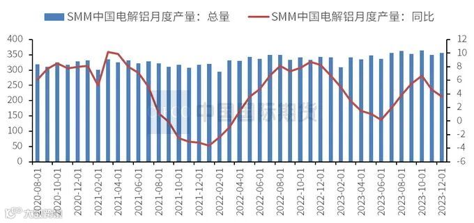 2023年全年国内电解铝累计产量达4151.3万吨,同比增长3.6%。其中2023年12月国内电解铝产量356.2万吨,同比增长3.6%。12月份内蒙古白音华剩余新增产能全部通电顺利投产。新疆、青海、内蒙古等地区出现的极寒天气导致电力负荷紧张,但对电解铝行业的冲击较小,月内仅四川及山西及个别企业有少量检修,总规模约3万吨。截止12月底,SMM统计国内电解铝建成产能约4519万吨,运行产能约4198万吨,行业开工率环比增长0.2%至92.9%。