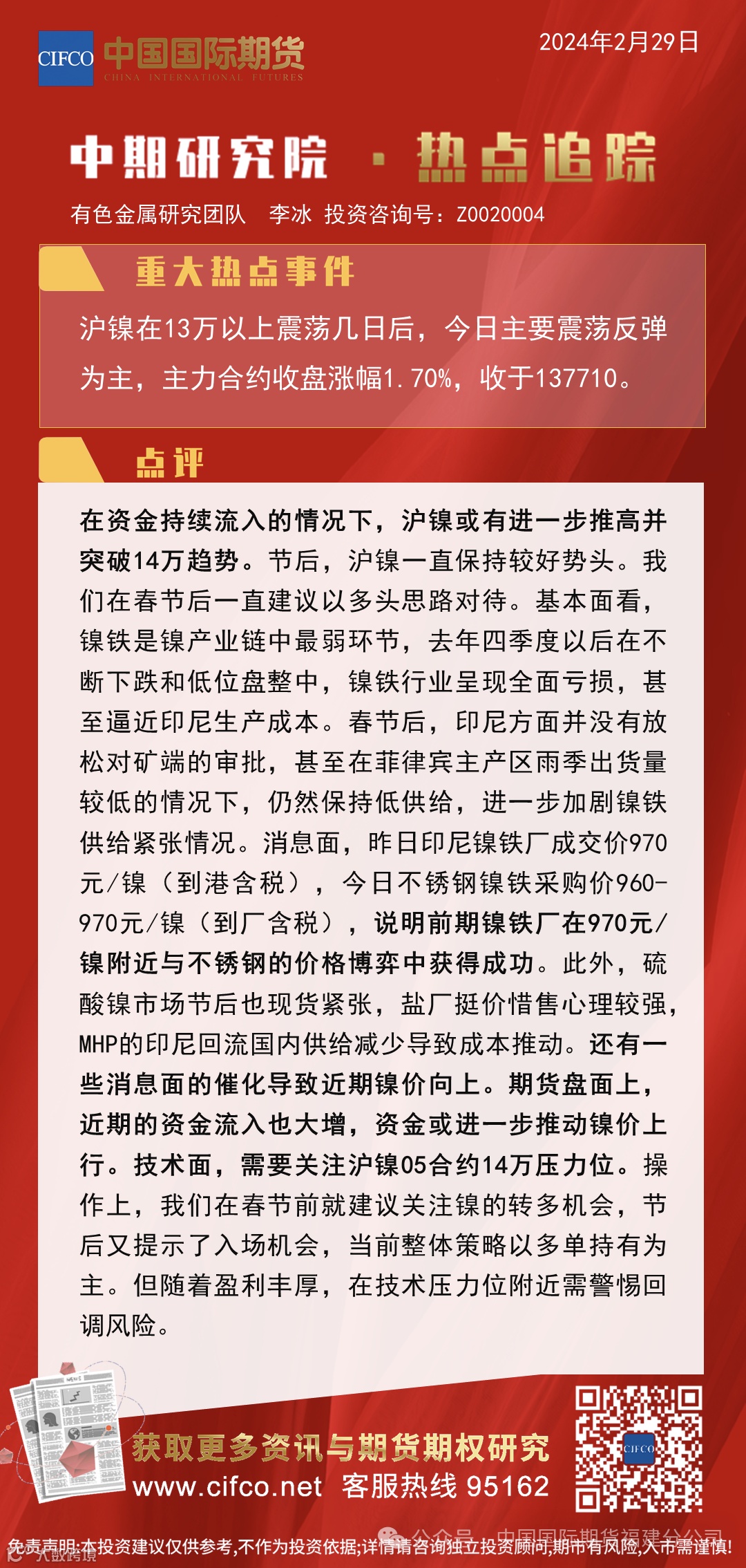 热点① 碳酸锂2月29日加速上行,主力合约盘中涨幅超过9%,站稳在11万以上。 热点② 沪镍在13万以上震荡几日后,2月29日主要震荡反弹为主,主力合约收盘涨幅1.70%,收于137710。