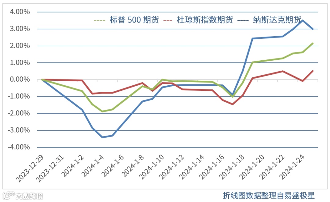 过去两日市场消息好坏参半,个股上,AI概念股长升长有,微软市值突破3万亿美元,超越苹果,英伟达,AMD,谷歌,meta等股价持续创新高,但tesla则斯人独憔悴,财报欠佳,再加上产量减少,以及2025年下半年才有新款,再加上整个电动车热潮的冷却都不停打击特斯拉表现,不过特斯拉对股指期货影响相当轻微,市场仍借助芯片供不应求,以及AI概念支撑,不过英特尔盘后公布的财报令人失望,导致纳指在收市后回吐。