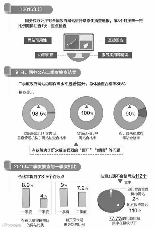2016年二季度抽查与一季度相比,合格率提升了3.5个百分点,存在大量空白栏目的网站比例由8.9%降至4%,首页面长期未更新的比例由9%降至7.2%。抽查发现不合格网站112个,其中地方政府网站110个,部门垂直管理机构网站2个,77.7%的问题网站集中在县级以下。