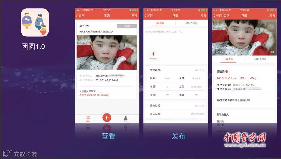 据公安部刑事侦查局介绍,该平台由阿里巴巴公司提供技术支持开发。通过一个名为“团圆1.0”的手机应用系统,部、省、市、县四级共5000余名打拐民警,获取儿童失踪信息后,将第一时间上报。