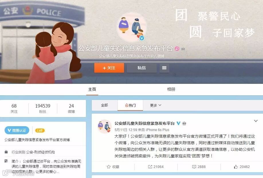 作为该平台的一部分,自5月11日“公安部儿童失踪信息紧急发布平台”官方微博正式开通,一周多时间,关注该微博的粉丝已超过19万。陈士渠说,关注“公安部儿童失踪信息紧急发布平台”官方微博,其发布的儿童失踪信息,用户随手一转发,就会为失踪儿童回家团聚、公安机关抓获犯罪嫌疑人增加更多机会。