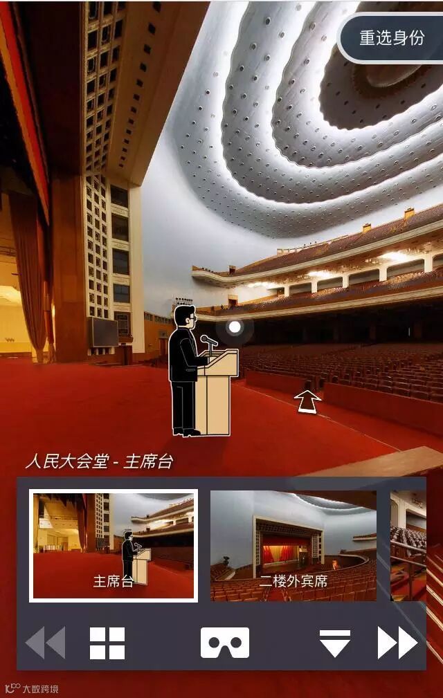 模拟人民大会堂全景。VR全景视频是今年两会的一大亮点,选择不同身份来模拟不同视角看到的画面,这使得新浪的作品在众多全景视频中脱颖而出。