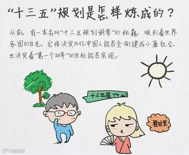 漫画解读“十三五”规划。用最简单的对白阐释“十三五”,画风和字体都十分可爱,颇有寓教于乐的趣味。