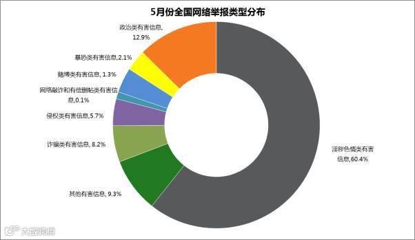 ◆ 5月份,中国互联网违法和不良信息举报中心直接受理、处置网民有效举报32071件。经核查,会同相关执法部门处置色情、诈骗、赌博网站及链接14920条。