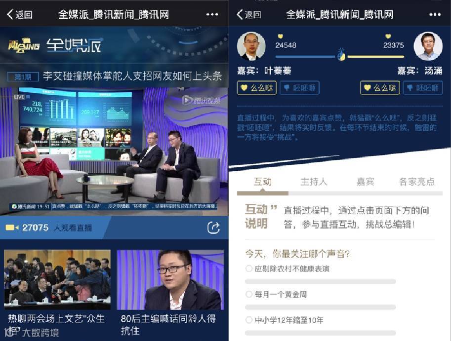 你的喜好会改变直播节目的走向?你关心的问题会成为媒体大咖热议的焦点?腾讯全媒派《两会ing》互动直播节目让你的参与感爆棚。李艾跨界主持,10位媒体“掌舵人”坐镇直播台,热聊两会民生热点,解读媒体后厨故事。你的参与将这样改变节目:实时呈现的“么么哒”点赞和“呸呸渣”喝倒彩结果将使得支持数少的嘉宾接到惩罚式“挑战”;因你的投票而产生的热门话题随时都可能得到嘉宾妙语连珠的解读,听起来好炫酷对不对?这档节目让网友从“等食者”变身“捕食者”,参与感妥妥的。