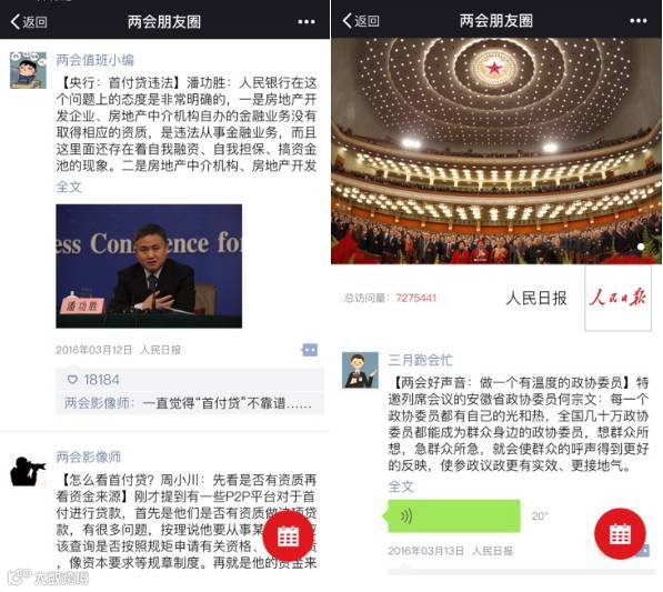 刷朋友圈就能看到来自前方的两会报道?没错!人民日报客户端的《两会朋友圈》将实时云直播搬进模拟朋友圈页面,并由两会值班小编、两会摄影师等“好友”实时更新每天的重要议程和精彩言论,不仅文字图片音视频多样呈现,还可以为感兴趣的内容点赞,这体验,就像真的把两会前方记者加为好友一样,目前,该产品页面显示访问量已突破七百万,有趣又实用的新玩儿法果真是网友的心头爱呢。