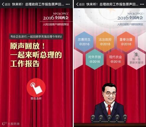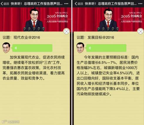 人民网选取政府工作报告中的关键词,将总理谈及关键词的原声音频套用微信语音的场景设置,配合文字,情景再现报告重要内容。
